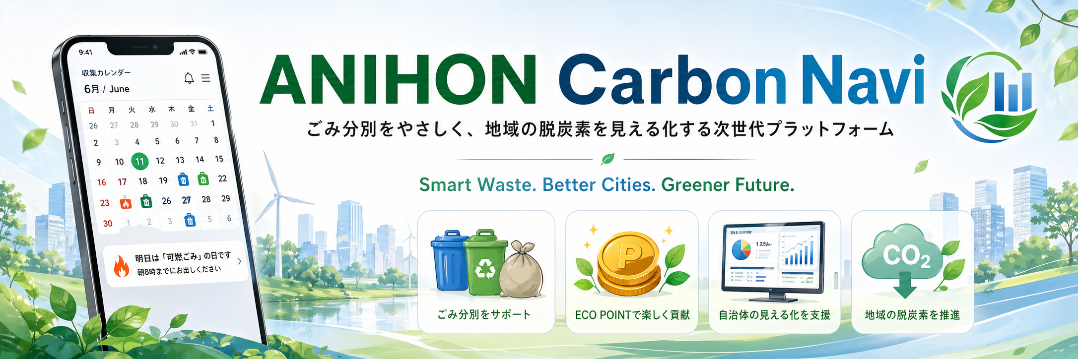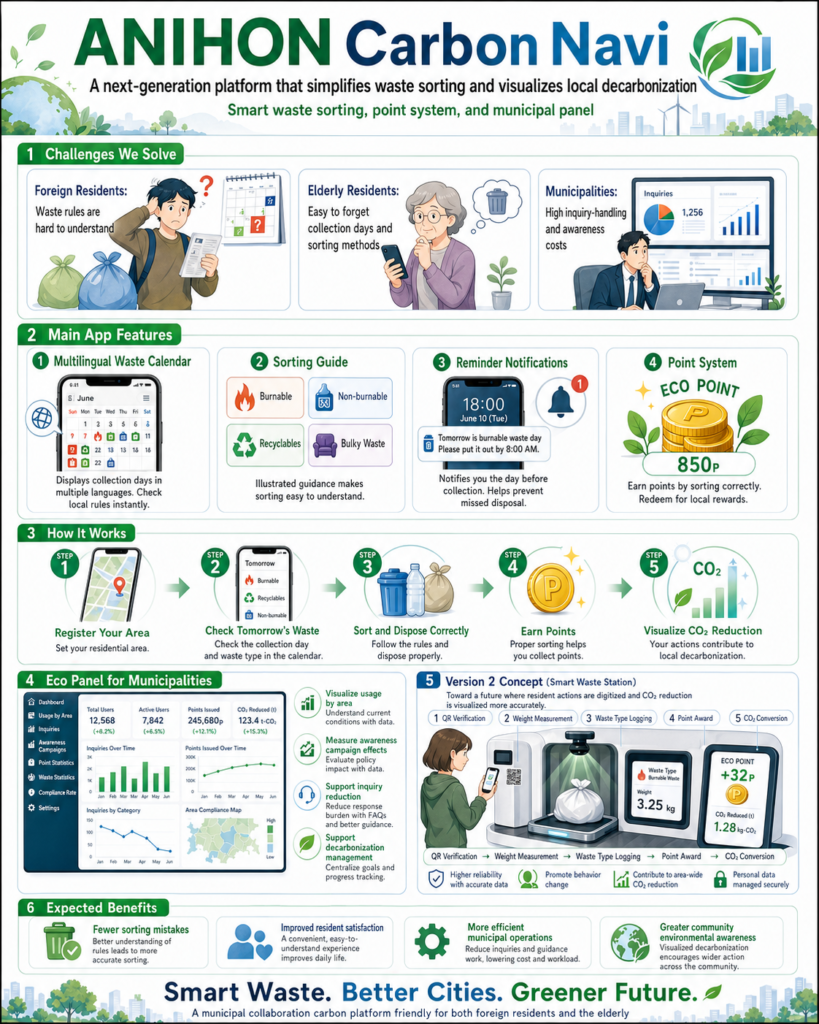 ANIHON Carbon Navi is not just a “garbage calendar app.” It is designed as a regional environmental DX/GX platform that combines multilingual life support, municipal digital services, environmental education, recycling promotion, and future CO₂ reduction visualization.